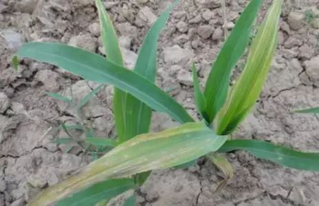 玉米苗期遇有較長(zhǎng)時(shí)間缺雨,造成大氣和土壤干旱,不能在土壤缺水時(shí)滿足玉米生長(zhǎng)發(fā)育的需要易造成死苗。玉米苗期干旱,幼株的上部葉片卷起,并呈暗色。嚴(yán)重時(shí)葉片邊緣或葉尖變黃,隨后下部葉片的葉尖端或葉緣干枯。在疏松沙土上幼苗干枯而死。